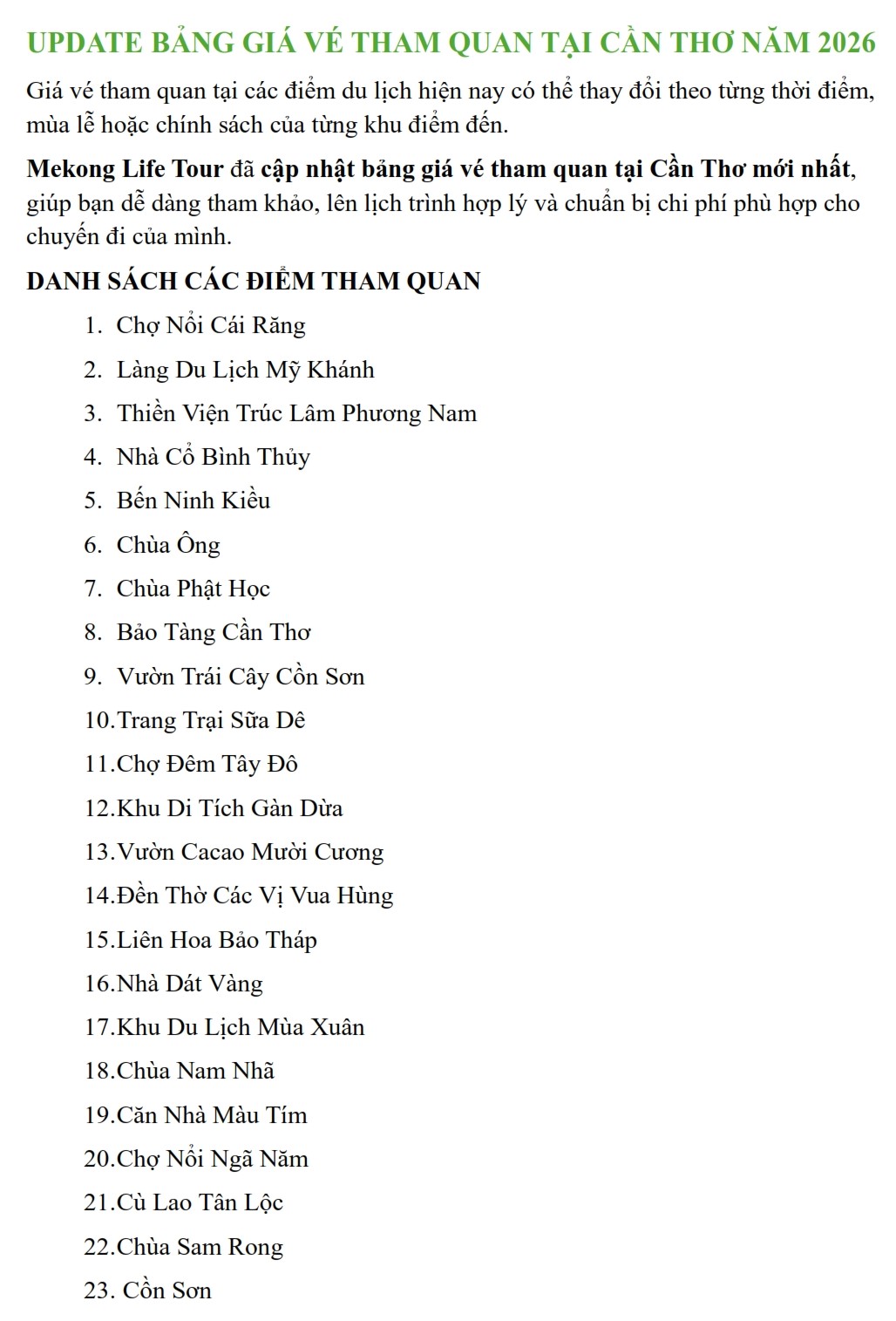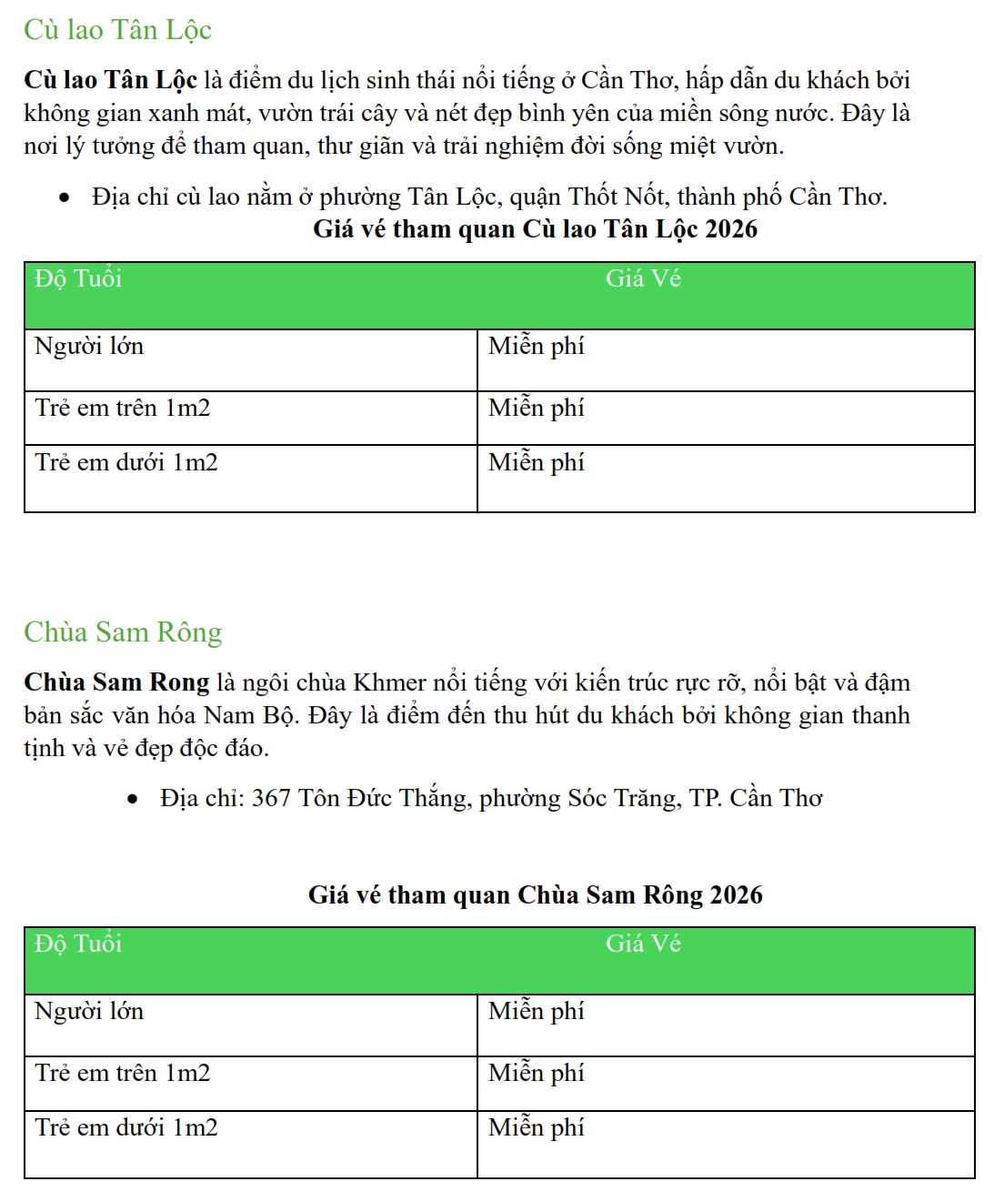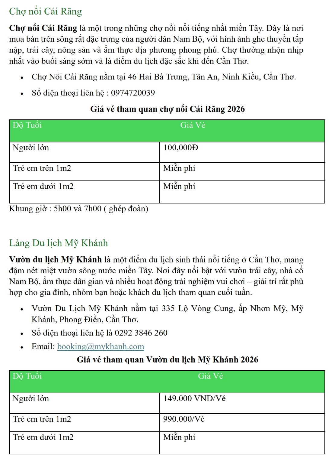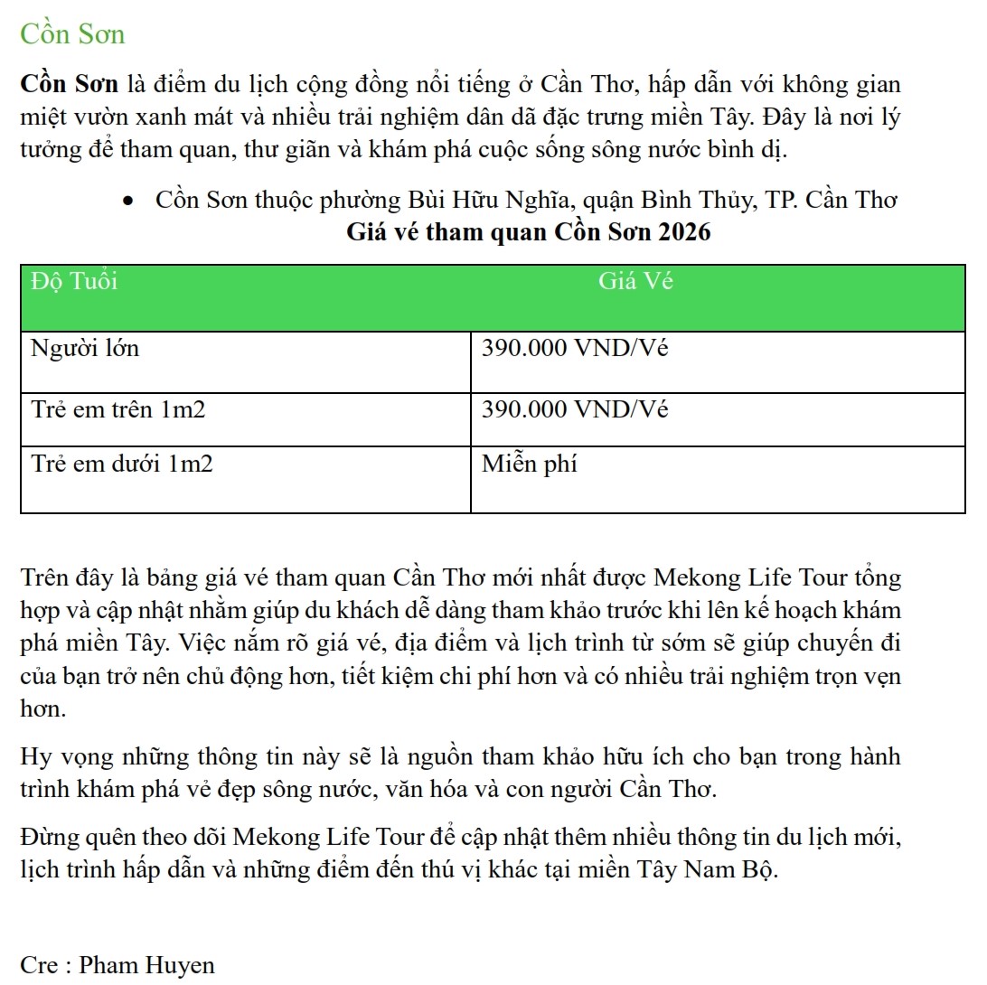 Update Bảng Giá Vé Tham Quan Tại Cần Thơ Năm 2026