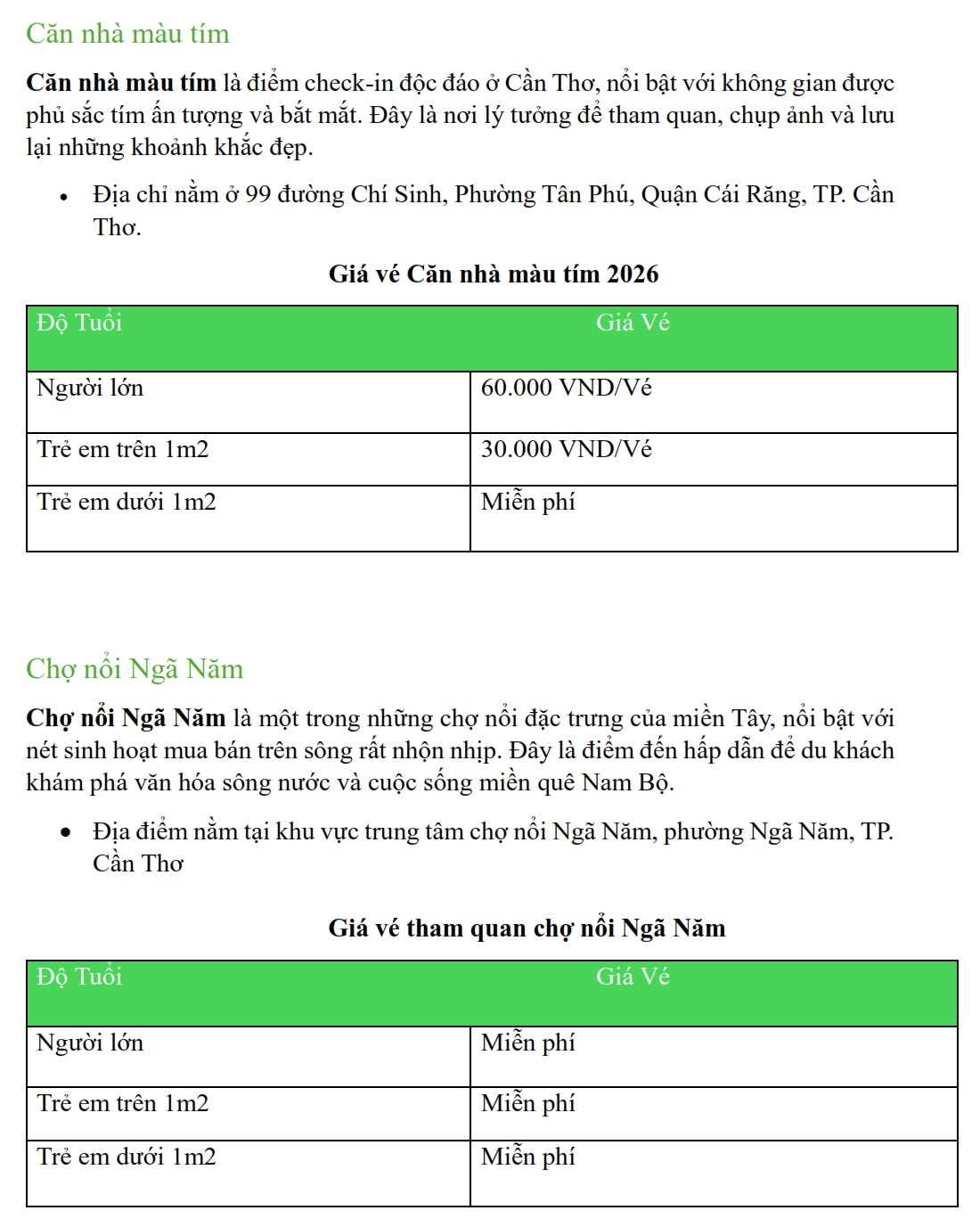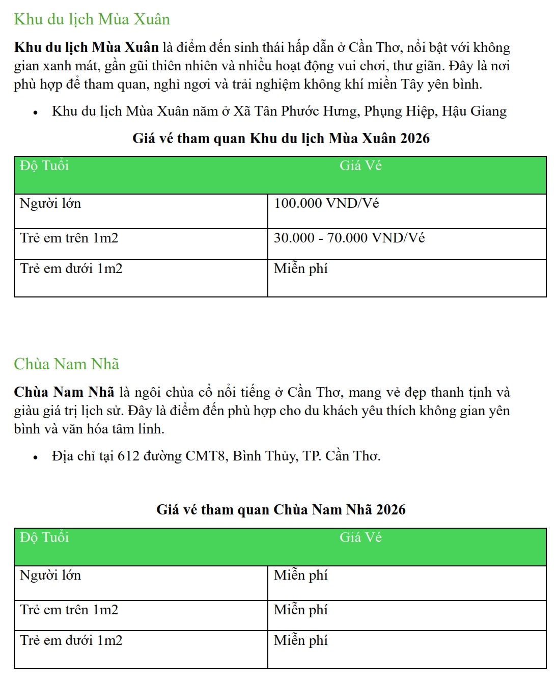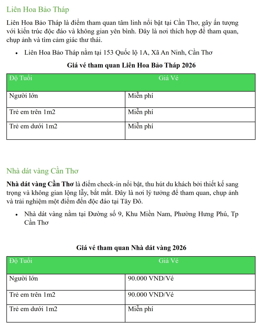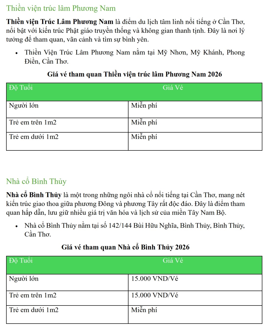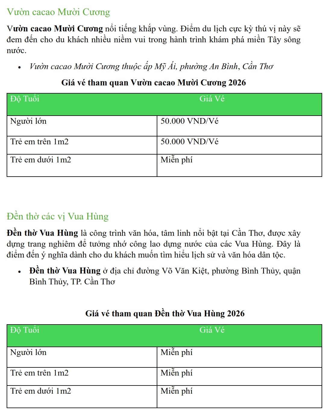 Update Bảng Giá Vé Tham Quan Tại Cần Thơ Năm 2026